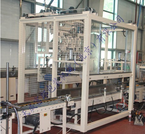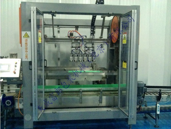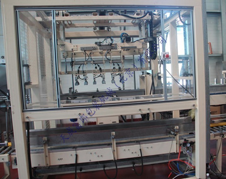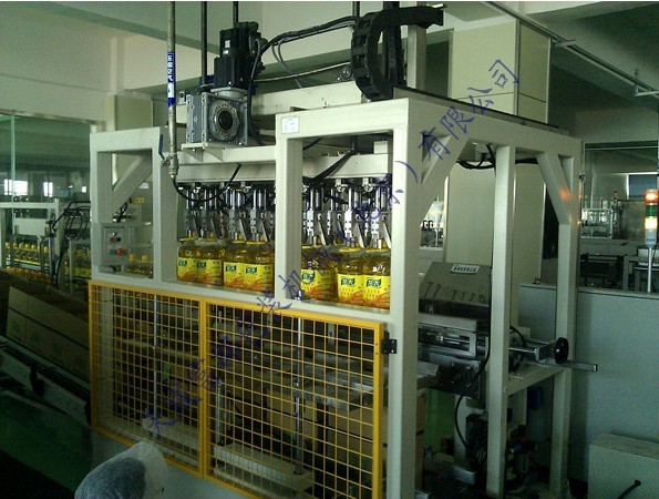 電動(dòng)裝箱機(jī)是一種智能性全自動(dòng)裝箱機(jī),采用高速分配裝置包裝各種容器,包裝塑料扁瓶、圓瓶、不規(guī)則形瓶,各種大小玻璃瓶,圓瓶、橢圓形瓶、方形罐及紙罐等,另外也適用于帶隔板的包裝箱。由瓶夾(內(nèi)置橡膠,以防損傷瓶體)夾住瓶體(每次2箱),放入打開(kāi)的紙箱當(dāng)中,當(dāng)抓頭抬起時(shí),將紙箱排出,送至封箱機(jī),本機(jī)采用P.L.C + 觸摸顯示屏控制。設(shè)有缺瓶報(bào)警停機(jī),無(wú)瓶不裝箱安全裝置。本流水線大大方便操作、管理、減少生產(chǎn)人員和勞動(dòng)強(qiáng)度,是自動(dòng)化規(guī)模生產(chǎn)必不可少的設(shè)備。
