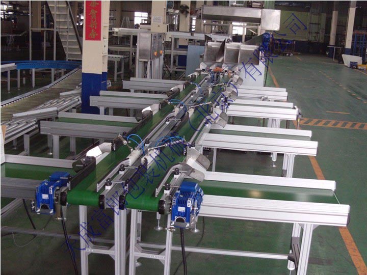結(jié)構(gòu)形式有:槽型皮帶機(jī)、平型皮帶機(jī)、爬坡皮帶機(jī)、轉(zhuǎn)彎皮帶機(jī)等多種形式,輸送 帶上還可增設(shè)提升擋板、裙邊等附件,能滿足各種工藝要求。輸送機(jī)兩側(cè)配以工作臺(tái)、加裝燈架,可作為電子儀表裝配,食品包裝等裝配線。